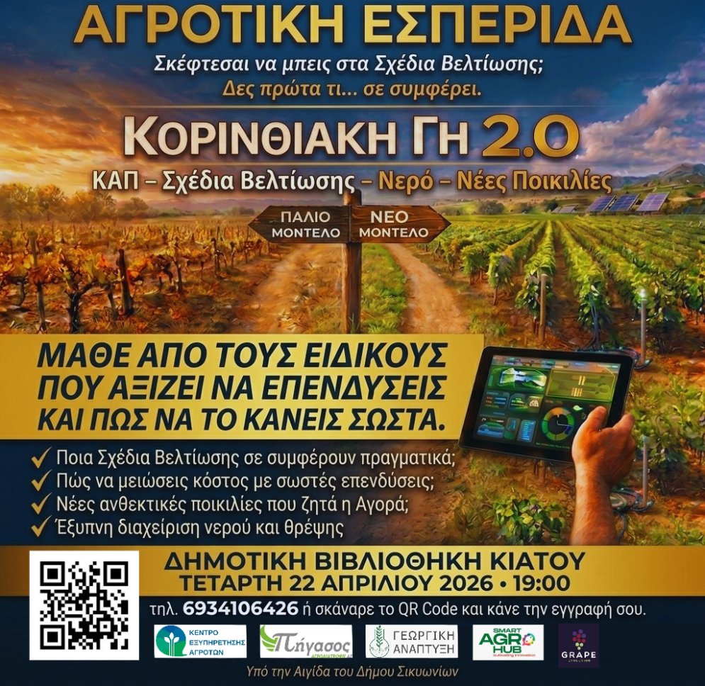 Η γεωργία αλλάζει κατεύθυνση και οι αποφάσεις των παραγωγών γίνονται πλέον πιο κρίσιμες από ποτέ. Σε αυτό το περιβάλλον, όπου η νέα ΚΑΠ, το αυξανόμενο κόστος παραγωγής και οι απαιτήσεις της αγοράς διαμορφώνουν ένα εντελώς διαφορετικό τοπίο, διοργανώνεται η Αγροτική Εσπερίδα «Κορινθιακή Γη 2.0: ΚΑΠ – Σχέδια Βελτίωσης – Νερό – Νέες Ποικιλίες», την Τετάρτη 22 Απριλίου 2026 και ώρα 19:00, στη Δημοτική Βιβλιοθήκη Κιάτου, υπό την αιγίδα του Δήμου Σικυωνίων.