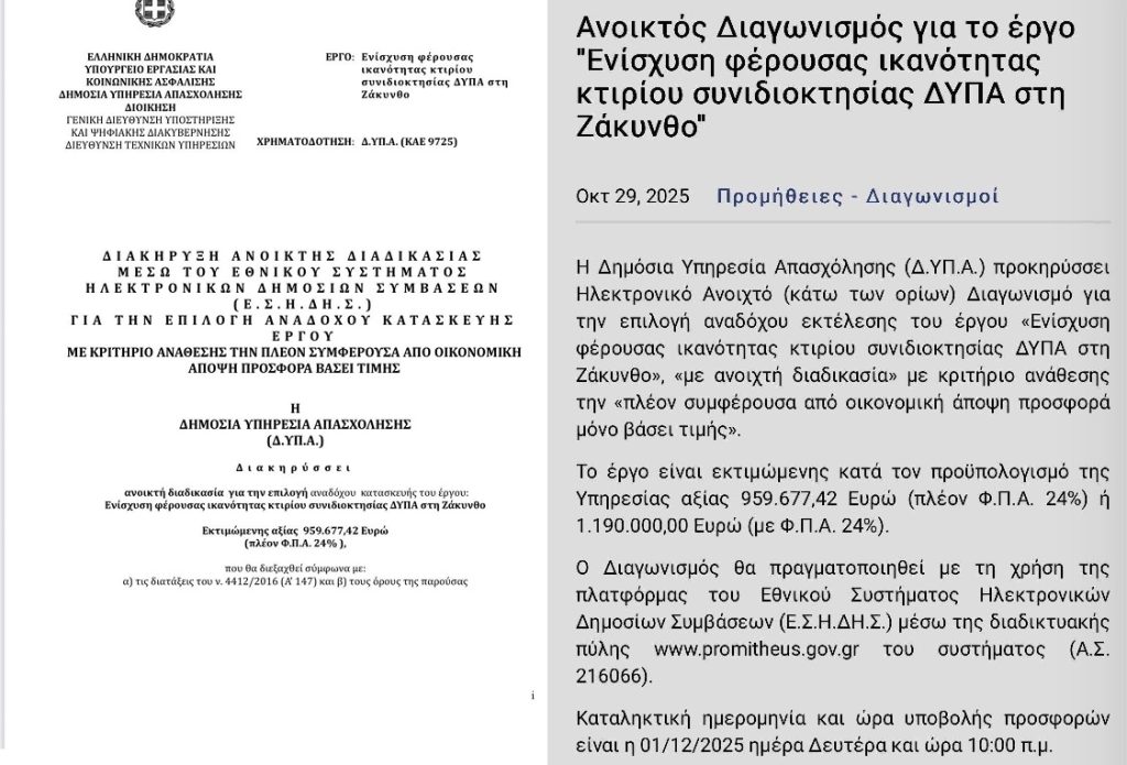 Με ιδιαίτερη ικανοποίηση και αίσθημα ευθύνης, ανακοινώνω την έναρξη της διαδικασίας για την υλοποίηση του έργου «Ενίσχυση Φέρουσας Ικανότητας κτιρίου (Εργατικού Κέντρου Ζακύνθου), συνιδιοκτησίας Δ.ΥΠ.Α. στη Ζάκυνθο»