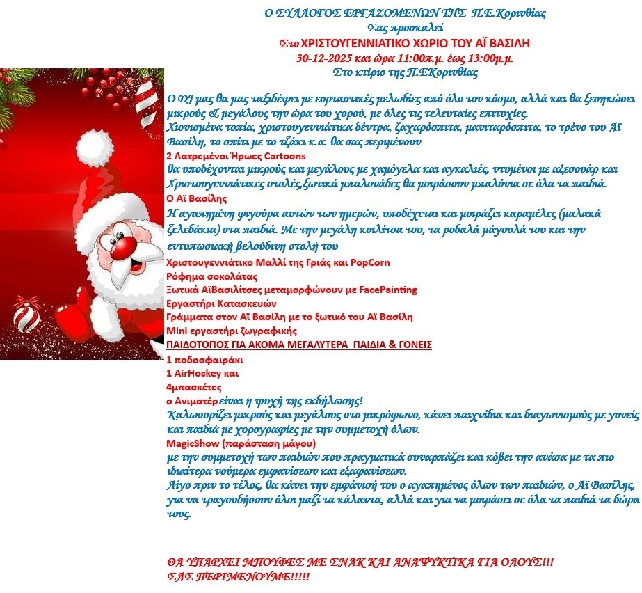 Ο Σύλλογος Εργαζομένων στην Περιφερειακή Ενότητα Κορινθίας διοργανώνει την Τρίτη 23 Δεκεμβρίου
