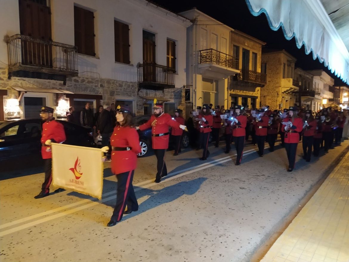 Λίγο μετά τις 9 μ.μ. ο καθ’ ύλην Αντιδήμαρχος για την Εποπτεία και το Συντονισμό του Δήμου στη Δ.Ε. Ευρωστίνης κ. Ανδρέας Καραβάς, ο Πρόεδρος της Κοινότητας Δερβενίου κ. Γιάννης Ροδόπουλος, ο Επικεφαλής της ελάσσονος μειοψηφίας του δημοτικού συμβουλίου του Δήμου Ξυλοκάστρου – Ευρωστίνης κ. Σπύρος Καραβάς και πλήθος κόσμου υπό του φωτός των κεριών τους και εν μέσω πένθιμων ήχων της Δημοτικής Φιλαρμονικής Δερβενίου και πένθιμων κωδωνοκρουσιών συνόδευσαν την λιτάνευση και την περιφορά του Επιταφίου στους κεντρικούς δρόμους του Δερβενίου.
